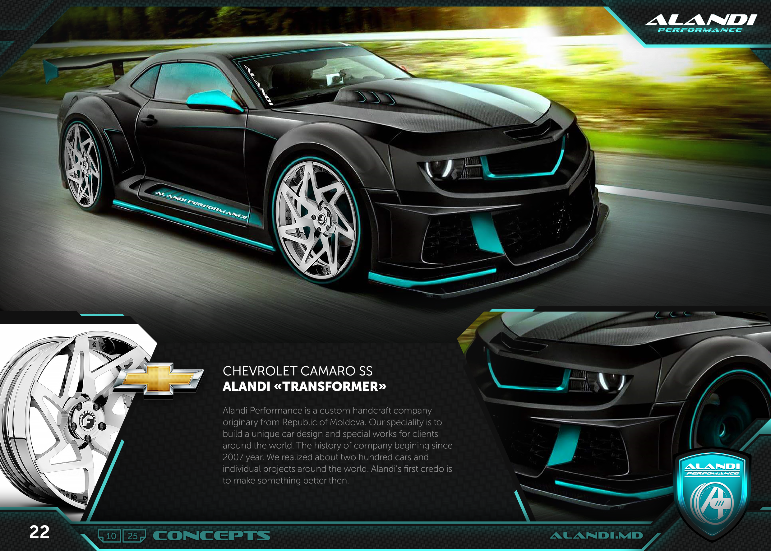 A long front bumper, an impressive hood and a disproportionately short stern clearly demonstrate the smoothness of its forms. Diffusers located behind the doors and strong wheel arches show its power. In accordance with exemplary muscle car ratios this car turned out to be slightly lower and shortened. Looking at the car you can see that the central axis of the cabin is slightly shifted to the stern.