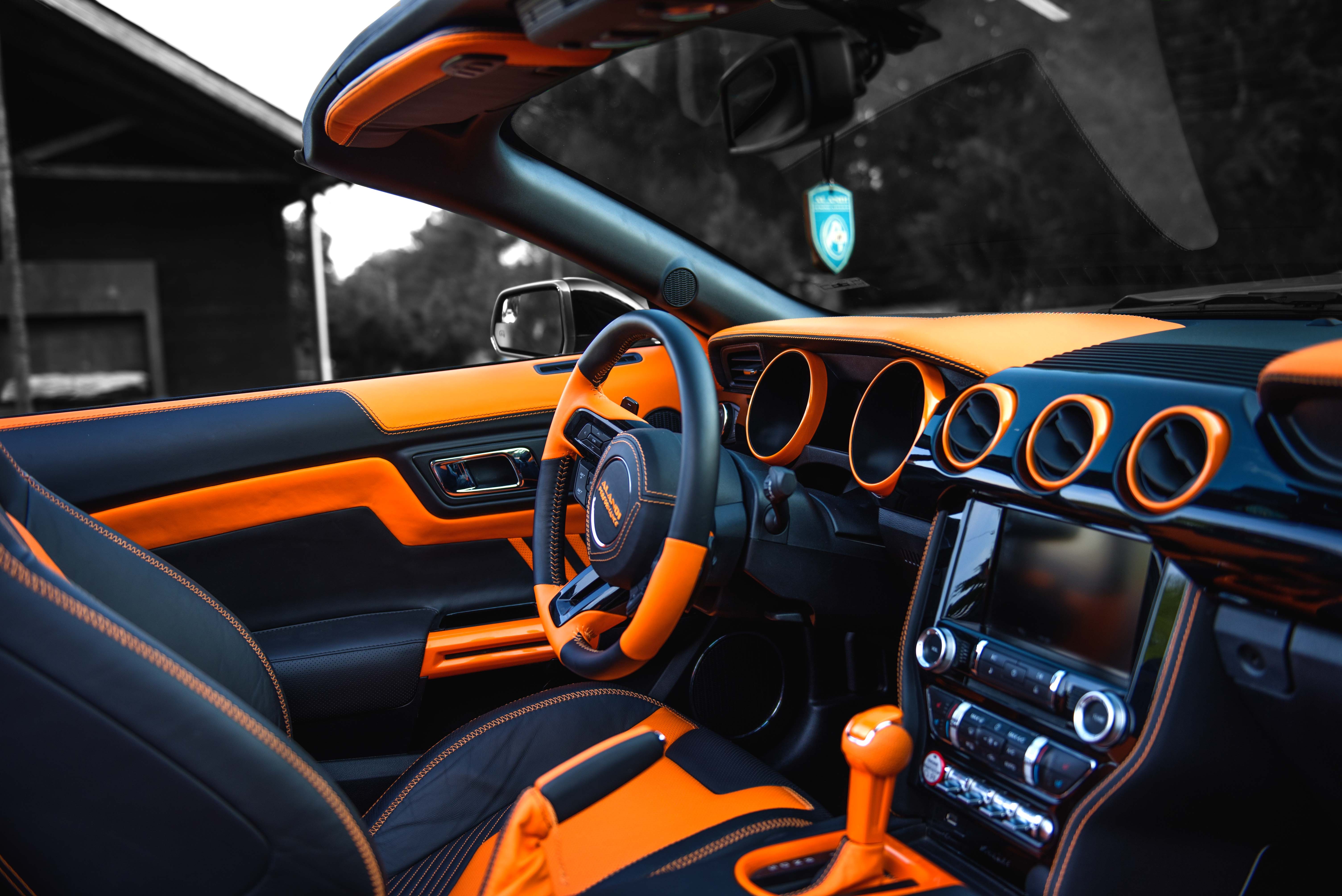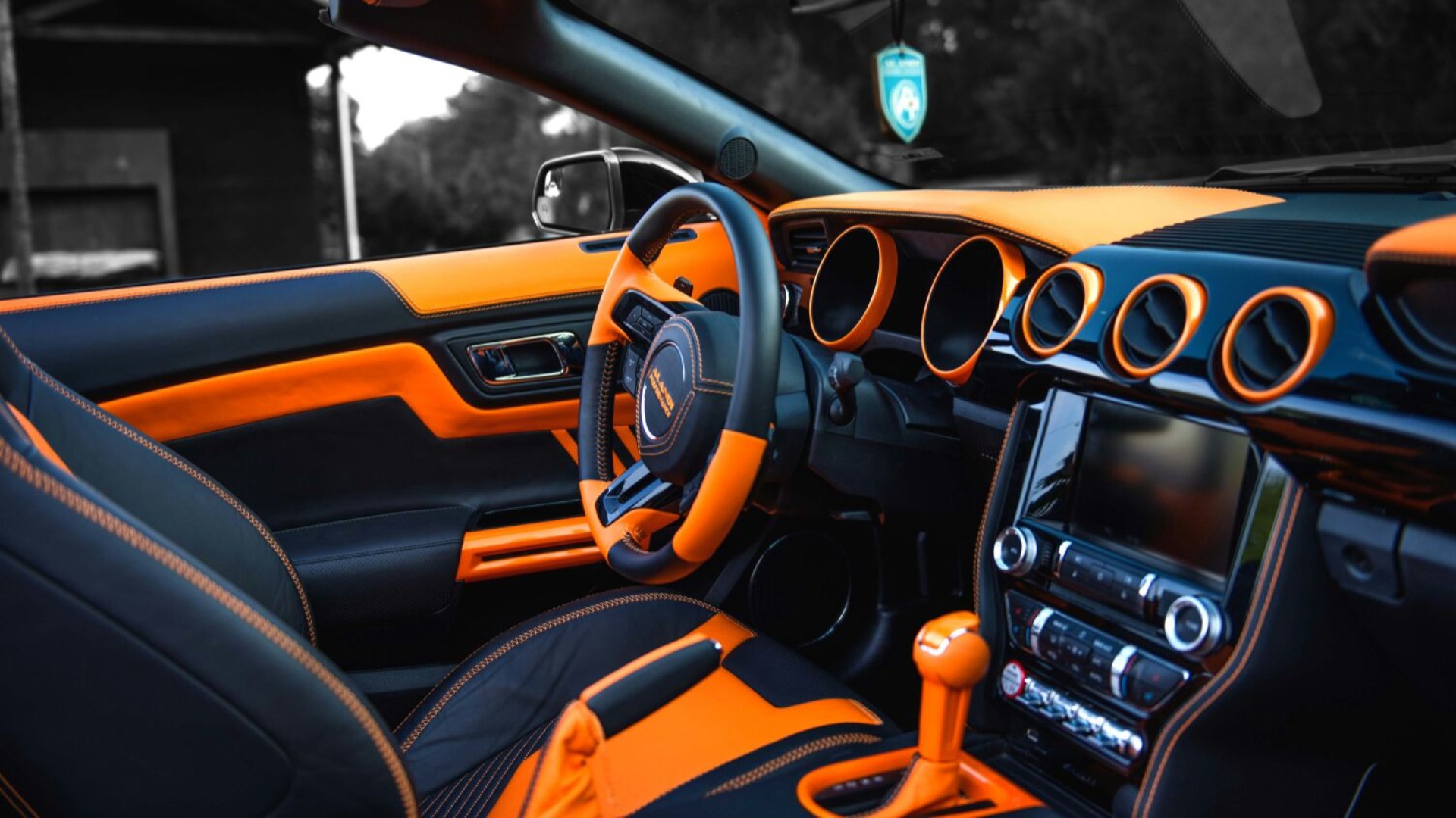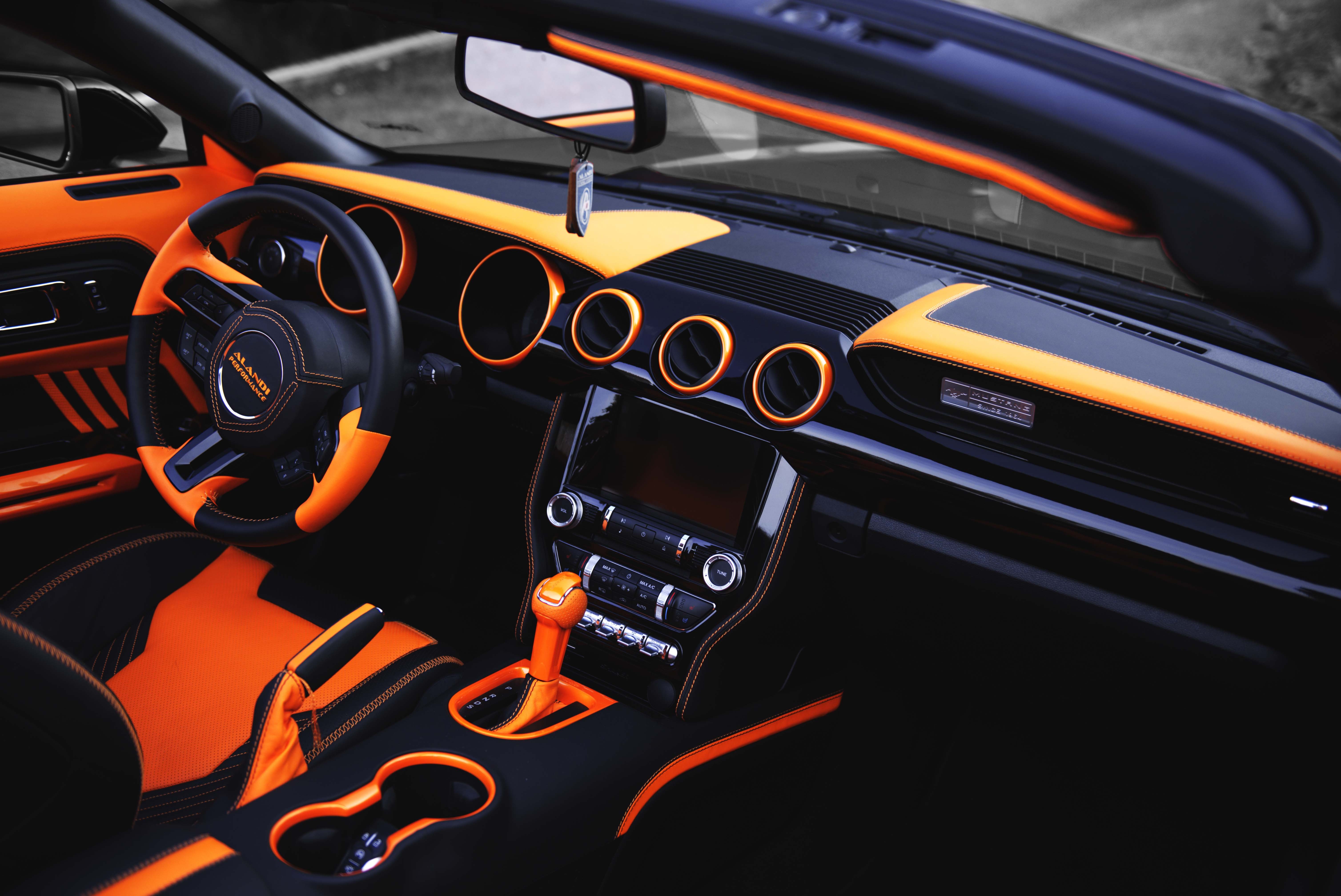 Black and orange colors – what do they have in common? Nothing and this is great. Making such an accentuated tandem we based our vision on the car’s exterior, client wishes and our own understanding of an ideal convertible. The leather of respective shades was used. Another simple and yet effective trick is refinishing the frames of gauges and vent deflectors in contrasting colors. The gearbox stick knob turned out to be especially fancy.